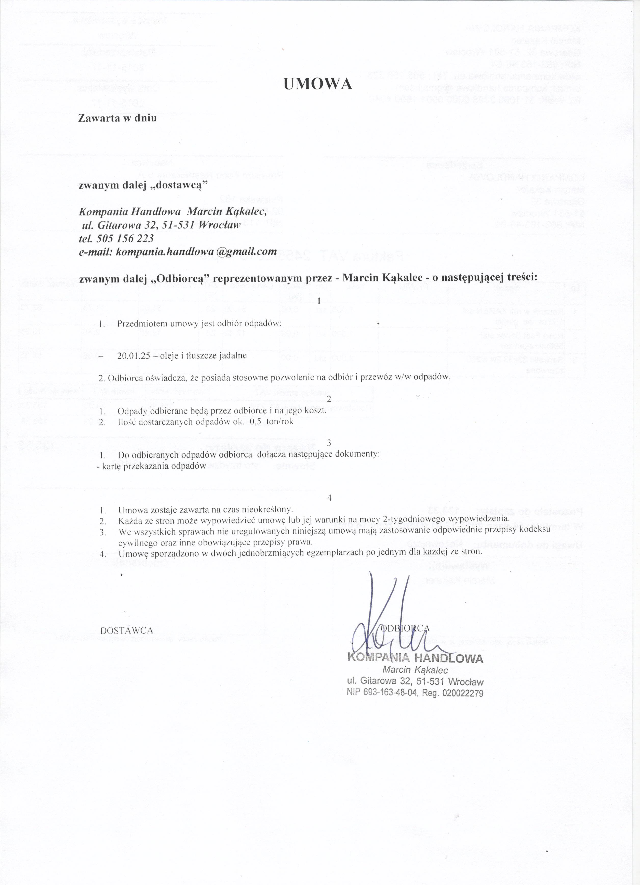 Odbieramy odpady tłuszczowe na terenie Wrocławia (do 24 godzin od momentu zgłoszenia, w dni robocze) i Dolnego Śląska (częstotliwość do uzgodnienia). Odpad powinien znajdować się w szczelnie zamkniętym pojemniku, w miejscu łatwo dostępnym dla naszego pracownika.